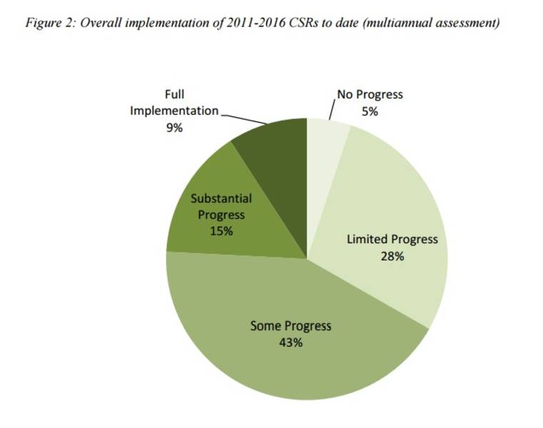 The main conclusion of the EC about the overall functioning of the European Semester is that the implementation of recommendations takes time. Progress on the implementation of recommendations from previous years is significantly higher than that of the most recent ones. This, according to the Commission, means that it is important to make an assessment of the medium term as well, rather than just looking at year-on-year performance. For example, two-thirds of the 2016 recommendations have a "some progress" status, which is an euphemism of almost no implementation. Since the beginning of the European Semester in 2011, the pace of progress, estimated year-on-year, has declined steadily. The EC explains this with the political sensitivity of the reforms. The easier ones are done first. This trend, however, has begun to reverse last year, the Commission believes.
