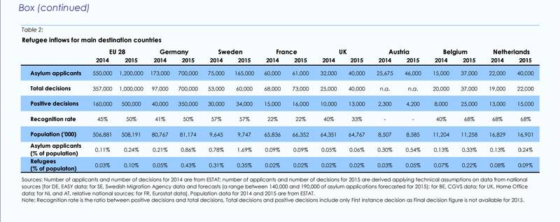 The EC forecasts that the strength of the refugee flow will remain constant at the third quarter of 2015 level throughout 2016. In 2017 a gradual normalisation of flows is expected. Throughout the three-year forecast period it is expected that another three million people will enter the EU, which means a 0.4% increase of the population. This forecast accounts for some asylum applications being rejected. Rejection of applications is also a source of uncertainty regarding the forecast, because in some states the share of approved applications is considerably lower compared to others and this does not seem to be proportional to the number of applicants. Again we are talking about applying different criteria and definitions.